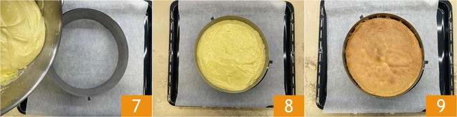 Gießen Sie die Masse in einen 22 cm Durchmesser Ring, der auf ein Backblech mit Backpapier gelegt wird 7. Sie sollten 3/4 der Kapazität erreichen und glattstreichen 8. Im vorgeheizten statischen Ofen bei 175°C für 25 Minuten backen. Sobald es gekocht ist, aus dem Ofen nehmen und abkühlen lassen 9.