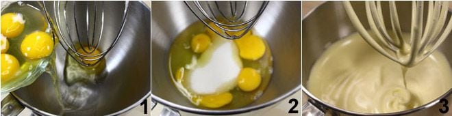 Um den Biskuitteig mit Reismehl zuzubereiten, beginnen Sie damit, die Eier bei Zimmertemperatur in eine Küchenmaschine zu geben 1, fügen Sie dann den Zucker hinzu 2 und schlagen Sie die Zutaten mindestens 10/15 Minuten mit dem Schneebesen, bis Sie eine schaumige, voluminöse und hellgelbe Masse erhalten 3.