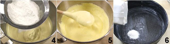 Wenn Sie möchten, können Sie, sobald die Masse gut aufgeschlagen ist, die Samen der Vanilleschote hinzufügen, die Sie halbiert haben, und einige Sekunden weiter schlagen, um sie gut zu vermischen und den Teig zu aromatisieren. Jetzt können Sie das vorher gut gesiebte Reismehl hinzufügen 4: Mischen Sie alles mit einem Holzlöffel, bis eine homogene Masse entsteht, und achten Sie darauf, dass sie nicht zusammenfällt 5.