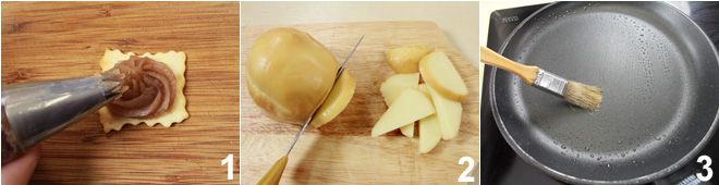 Um die Blätterteigstücke mit Kastaniencreme und geräucherter Scamorza zuzubereiten, beginnen Sie damit, jedes Stück mit einem gehäuften Teelöffel Kastaniencreme zu bestreichen (wenn Sie möchten, können Sie dabei eine Spritztüte mit gezackter Öffnung verwenden) 1.