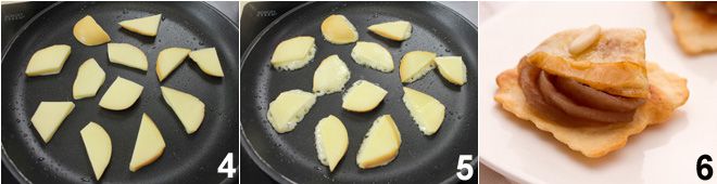 und wenn sie gut heiß ist, legen Sie die Scamorza-Stückchen darauf 4. Sobald eine goldene Kruste auf einer Seite entstanden ist 5, drehen Sie sie um, um die Garzeit zu vervollständigen. Legen Sie die Scheibe geräucherte Scamorza (mit einem Pfannenwender anhebend) auf jedes Blätterteigstück und dekorieren Sie die Häppchen mit Pinienkernen 6!