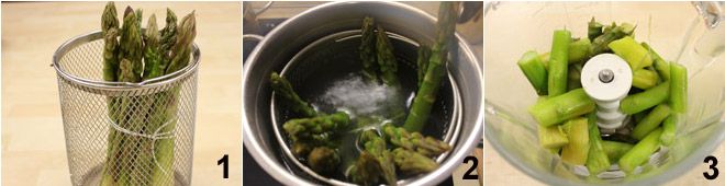 Beginnen Sie die Zubereitung der Häppchen, indem Sie die Spargel nach der Anleitung hier reinigen (Kochschule "Spargel reinigen"). Dann kochen Sie die Spargel in dem speziellen "Spargeltopf" 1. Füllen Sie den Spargeltopf zu etwa 2/3 mit Wasser und kochen Sie 2 die Spargel, bis sie zart sind. Die Spitzen, die aus dem Wasser ragen, sollen nur mit dem Dampf garen. Nach dem Kochen geben Sie sie in den Mixer 3, und falls nötig, fügen Sie einen Teelöffel Öl hinzu, um die Creme zu verdicken.