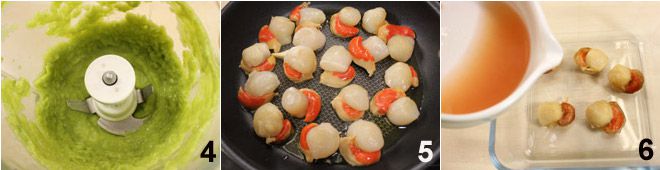 Würzen Sie die erhaltene Creme mit Salz und Pfeffer 4 und stellen Sie sie beiseite. Braten Sie eine Knoblauchzehe leicht in einer Pfanne mit zwei Esslöffeln Olivenöl an, fügen Sie die Jakobsmuscheln hinzu und braten Sie sie jeweils 1 Minute auf jeder Seite 5, salzen Sie sie schließlich. In der Zwischenzeit pressen Sie die Grapefruit und die Zitrone aus und würzen die Jakobsmuscheln mit dem gewonnenen Saft 6. Nun stellen Sie die Häppchen zusammen: Nehmen Sie ein knuspriges Olivengebäck, bestreichen Sie es mit einem Teelöffel Spargelcreme und legen Sie eine Jakobsmuschel darauf, schließlich garnieren Sie mit der geriebenen Schale der Grapefruit.