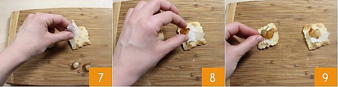 und legen Sie auf jede einige Raspadüra-Späne 7 und ein paar noch warme karamellisierte kleine Zwiebeln 8. Schließlich das Ganze mit einem Hauch von Schnittlauch garnieren 9. Die Blätterteige mit Oliven und karamellisierten Zwiebeln sind servierfertig!