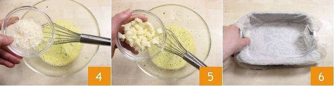 und fügen Sie dann zuletzt die Käsesorten hinzu: den geriebenen Parmesan 4 und den gewürfelten Scamorza 5. Befeuchten und wringen Sie ein Blatt Backpapier aus und legen Sie eine Backform der Größe 15x21 cm damit aus 6.