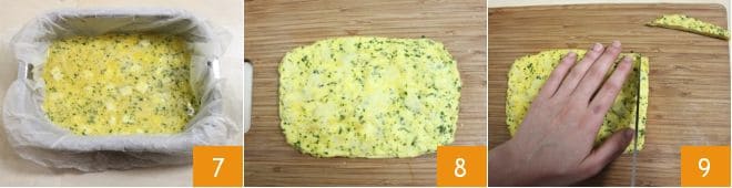 Gießen Sie die Mischung in die Backform 7 und backen Sie sie im vorgeheizten Ofen bei 180° für etwa 25-30 Minuten. Nehmen Sie sie heraus, lassen Sie sie abkühlen und stürzen Sie sie auf ein Schneidebrett 8. Schneiden Sie nun die Frittata in Streifen, die etwa einen Zentimeter breit sind 9