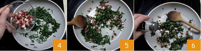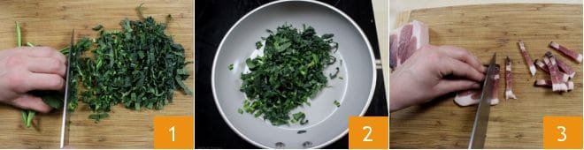 Um die Blätterteigschnecken mit Speck und Schwarzkohl zuzubereiten, beginnt damit, den Schwarzkohl unter fließendem Wasser zu waschen. Entfernt die äußeren Blätter, wenn sie Makel haben oder zu hart sind, und schneidet die anderen Blätter in feine Streifen 1. Gebt einen Schuss Öl in eine große Pfanne und fügt die Kohlstreifen hinzu 2: Lasst den Schwarzkohl etwa 5 Minuten lang welken. In der Zwischenzeit schneidet ihr den Speck in gleich große Würfel 3.