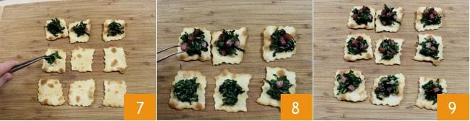 Jetzt, wo eure Füllung fertig ist, schaltet ihr die Hitze aus und beginnt, eure leckeren Fingerfood-Häppchen zu komponieren: Legt die Blätterteigschnecken auf das Schneidebrett und gebt auf jede einen Klecks Schwarzkohl und Speckwürfel, wobei ihr euch mit einer Küchenzange helft (7-8). Serviert eure Blätterteigschnecken mit Speck und Schwarzkohl lauwarm oder kalt als Aperitif 9!
