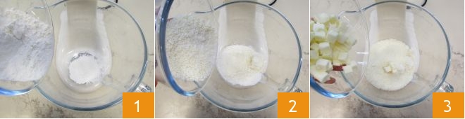 Um den Blumenkohlkuchen zuzubereiten, beginnen Sie mit der Herstellung des salzigen Mürbteigs. Geben Sie das Mehl in die Schüssel einer Küchenmaschine 1, den Pecorino und den Grana Padano 2. Fügen Sie dann die kalte Butter in Würfeln aus dem Kühlschrank hinzu 3, eine Prise Salz und Pfeffer.