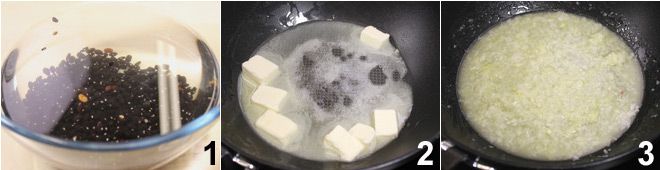 Um die Bohnencreme vorzubereiten, legen Sie die Bohnen für 12 Stunden in reichlich kaltem Wasser ein (es wäre besser, sie am Vorabend einzuweichen und über Nacht im Wasser zu lassen) 1. Nach der Einweichzeit die Bohnen abspülen und abtropfen lassen. Setzen Sie die Zubereitung unserer Bohnencreme fort, indem Sie die Zwiebel und den Knoblauch putzen und schälen, hacken und in einen Topf mit der geschmolzenen Butter geben 2, um sie anzudünsten 3;