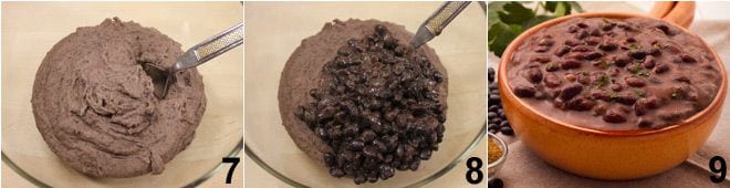 Nehmen Sie 3/4 der Bohnen, zerdrücken Sie sie mit einer Gabel oder pürieren Sie sie 7; mischen Sie dann das Bohnenpüree mit den ganzen Bohnen 8; und geben Sie die erhaltene Bohnencreme in 4 individuelle Schälchen, die Sie warmgehalten haben 9.