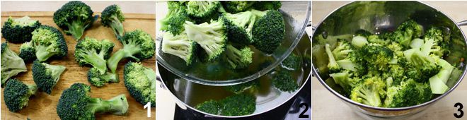 Um die Brokkoliaufläufe zuzubereiten, beginnen Sie damit, den Brokkoli zu reinigen: Trennen Sie die Röschen vom Stamm 1, waschen Sie sie und legen Sie sie beiseite. Schälen Sie die Brokkolistiele und schneiden Sie sie in Stücke. Kochen Sie dann den Brokkoli in reichlich kochendem Wasser 2, lassen Sie das Gemüse abtropfen und legen Sie es in ein Sieb, damit das überschüssige Wasser abtropft 3.