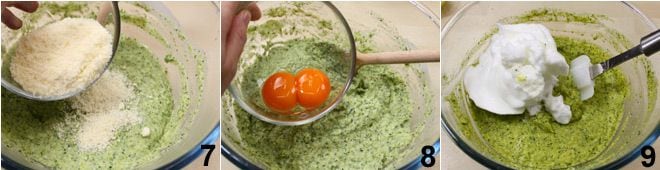 den geriebenen Käse 7 und die beiden Eigelbe 8 (heben Sie das Eiweiß auf); mischen Sie die Zutaten, dann salzen und pfeffern Sie nach Geschmack. Schlagen Sie das Eiweiß zu steifem Schnee und heben Sie es vorsichtig mit einem Gummispachtel unter die Brokkolimischung 9, vorsichtig, um die Masse nicht zu entlüften.