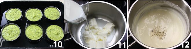 Fetten Sie die Förmchen ein und füllen Sie sie mit der erhaltenen Mischung; stellen Sie eine Pfanne auf den Herd, die die Förmchen aufnehmen kann, und füllen Sie sie zu einem Drittel ihrer Höhe mit Wasser: Wenn das Wasser kocht, nehmen Sie es vom Herd, tauchen Sie die Förmchen in das Wasserbad 10 und backen Sie sie im vorgeheizten Ofen bei 180°C etwa 40 Minuten. Zehn Minuten vor Ende der Backzeit bereiten Sie die Ziegenkäsesauce zu: Geben Sie den Käse in Stücke in einen Topf bei sehr niedriger Hitze und fügen Sie wenig Milch hinzu 11, gerade so viel, dass der Ziegenkäse schmilzt und eine mehr oder weniger dichte Creme entsteht, je nach Geschmack. Salzen, fügen Sie frisch gemahlenen weißen Pfeffer hinzu 12 und rühren Sie, bis eine homogene und klumpenfreie Creme entsteht.