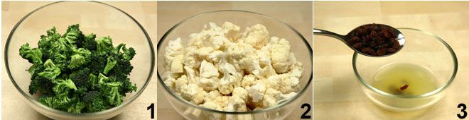 Reinigt den Brokkoli 1 und den Blumenkohl 2 und schneidet sie in kleine Röschen, sodass sie in einem Bissen gegessen werden können, wobei der Stiel des Blumenkohls erhalten bleibt. Kocht die Brokkoli- und Blumenkohlstückchen in getrennten Töpfen mit kochendem Salzwasser (sie haben unterschiedliche Garzeiten), bis sie zart, aber noch ziemlich knackig sind. In der Zwischenzeit weicht einen Esslöffel Rosinen im Zitronensaft ein 3.