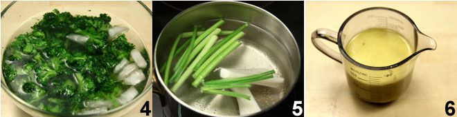 Legt die gerade abgetropften Brokkolis in eine Schüssel mit Eis 4, um sie sofort abzukühlen, damit sie ihre knackige Konsistenz und ihre leuchtend grüne Farbe behalten. Sobald sie kalt sind, lasst sie abtropfen. Nehmt den Stiel des Blumenkohls, schneidet zwei Stücke ab und kocht sie zusammen mit den Petersilienstängeln 5, die ihr gewaschen und in Stücke geschnitten habt. Wenn die Stängel zart sind, lasst sie abtropfen und püriert sie in einem Mixer, indem ihr etwas von ihrem Kochwasser hinzufügt, bis eine dicke, samtige Creme entsteht. Gebt in ein Glas eines Mixers (oder in den Mixer) das Öl, den Zitronensaft, die Blumenkohlcreme und Petersilienstängel, den Senf und eine Prise Muskatnuss und mixt alles 6. Schließlich mit Salz und Pfeffer abschmecken.