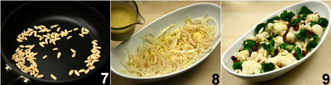 Röstet die Pinienkerne in einer Pfanne 7, bis sie eine schöne kupferfarbene Farbe annehmen. Schneidet den Chicorée in dünne Streifen, legt sie auf den Boden des Tellers und würzt sie mit etwas Dressing 8. Fügt den Blumenkohl und die Brokkoliröschen hinzu und verteilt einen Esslöffel Dressing über das Gemüse. Schließlich streut die Pinienkerne und die Rosinen 9 darüber und beendet mit einer Prise Muskatnuss und schwarzem Pfeffer.