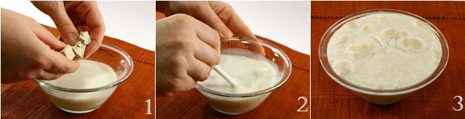 In einer kleinen Schüssel die lauwarme Milch, den Zucker und die zerbröckelte Hefe vermischen 1; rühren, bis sich die Hefe aufgelöst hat 2, dann die Schüssel an einem warmen Ort (nicht über 35 Grad) für etwa 20 Minuten ruhen lassen und aufgehen lassen 3.