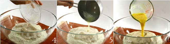 Nach der angegebenen Zeit die Mischung in eine große Schüssel 4 geben, die das Mehl, die Samen der Vanilleschote, die geriebene Zitronen- (oder Orangen-) Schale und eine Prise Salz enthält; die geschmolzene Butter 5, die geschlagenen Eier 6 hinzufügen und die Zutaten gut kneten, bis ein Teigball 7 entsteht, den Sie 30 Minuten lang an einem warmen Ort ruhen lassen.