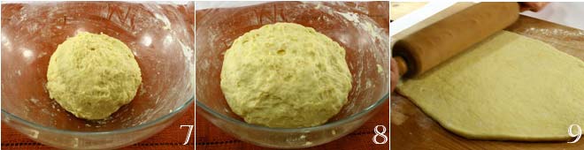 Nach einer halben Stunde den aufgegangenen Teig 8 nehmen und auf einem Nudelbrett ausrollen, bis eine Teigdicke von 1 cm erreicht ist 9;