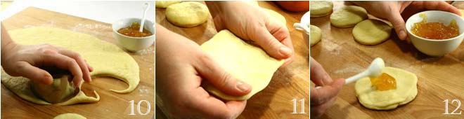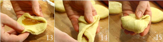 Mit einem runden Ausstecher mit einem Durchmesser von 6-8 cm mindestens 12 Kreise 10 ausstechen. Die Teigkreise leicht mit den Fingern ausbreiten 11 und in die Mitte jedes Kreises einen Teelöffel Aprikosenmarmelade 12 geben, dann sorgfältig schließen, wie auf dem Foto gezeigt (13-14-15).