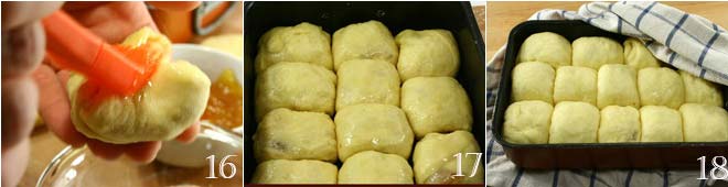 Die restliche Butter schmelzen und jedes Teigstück vollständig bestreichen 16, das Sie mit der Naht nach unten in eine gebutterte Backform legen 17. Die Buchteln eng nebeneinander anordnen, bis alle verbraucht sind, und 30 Minuten gehen lassen, wobei die Form mit einem sauberen Tuch abgedeckt wird 18; wenn etwas geschmolzene Butter übrig bleibt, gleichmäßig über die Buchteln in der Form gießen. Im bereits vorgeheizten Ofen bei 180° für 30 Minuten backen, dann die Buchteln aus dem Ofen nehmen, in der Form abkühlen lassen und dann auf eine Platte (oder Arbeitsfläche) stürzen, aufteilen und mit Puderzucker bestäuben. Servieren Sie sie noch warm.