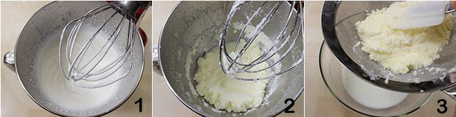 Um Butter zu Hause herzustellen, geben Sie die kalte Sahne aus dem Kühlschrank in eine Rührmaschine mit gut gekühlter Schüssel (wir empfehlen, den Behälter mindestens eine halbe Stunde vor der Verwendung in den Kühlschrank zu stellen). Starten Sie die Rührmaschine, beginnen Sie, die Sahne zu schlagen 1 und wenn sie steif geschlagen ist, schlagen Sie weiter, bis sich die Fette vollständig von den Flüssigkeiten getrennt haben 2 und die Sahne, die nun zu Butter geworden ist, eine gelbliche Färbung angenommen hat: Dies dauert etwa 20 Minuten. Wenn sich die Fette (d.h. die Butter) vollständig an die Rührbesen angehaftet haben, schalten Sie die Rührmaschine aus, entnehmen Sie die Masse und geben sie in ein Sieb, das in eine Schüssel gestellt wurde. Mit einem Spatel entfernen Sie die gesamte während der Verarbeitung entstandene Buttermilch 3