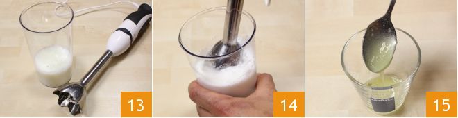 In einem hohen und schmalen Behälter gießen Sie die Milch ein 13, die unbedingt kalt sein muss, und schlagen Sie sie mit einem Stabmixer auf, indem Sie nur an der Oberfläche arbeiten 14. In vier mittleren Gläsern gießen Sie je 20 ml Orangensirup hinein und fügen Sie ein paar Schalenstückchen hinzu 15.