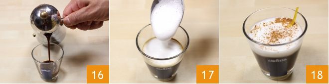 Gießen Sie den heißen Kaffee (eine Tasse, ca. 40 ml) in den Sirup jedes Glases 16 und fügen Sie 2-3 Esslöffel kalte Milchcreme oben hinzu 17. Dekorieren Sie schließlich den Orangenkaffee mit Milchluft mit einer leichten Prise Zimtpulver 18 und genießen Sie ihn sofort.
