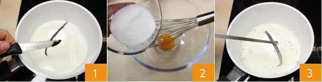 Um den Baiser Kaffee zuzubereiten, beginnen Sie mit der Zubereitung der Konditorcreme: Erhitzen Sie die Milch in einem kleinen Topf mit der Hälfte einer Vanilleschote und ihren Samen 1. Schlagen Sie in einer Schüssel das Eigelb und den Zucker mit einem Schneebesen 2 und fügen Sie dann das Mehl hinzu. Entfernen Sie die Schote mit einer Zange 3 und