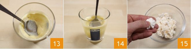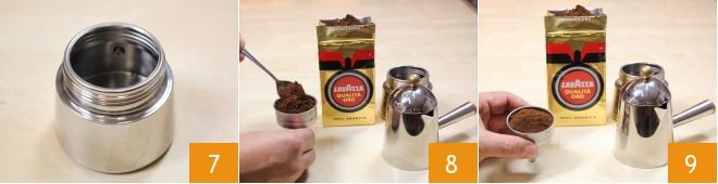 Bereiten Sie inzwischen den Kaffee mit der Kaffeemaschine zu: Um einen hervorragenden Kaffee zu erhalten, füllen Sie den Kessel Ihrer Kaffeemaschine mit kaltem Wasser, das möglichst kalkarm ist, und achten Sie darauf, das Sicherheitsventil nicht zu überschreiten 7 (ansonsten erhalten Sie einen längeren Kaffee). Füllen Sie den Filter mit gemahlenem Kaffee und formen Sie einen kleinen Hügel, den Sie durch Klopfen des Filters auf den Tisch nivellieren (8-9). Drücken Sie nicht mit einem Löffel und machen Sie keine Löcher in die Oberfläche.