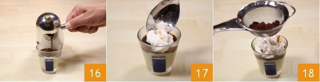 Gießen Sie den heißen Kaffee ein, bis die Creme vollständig bedeckt ist 16. Dekorieren Sie das Glas mit einem großzügigen Löffel zerbröselter Baisers 17 und einem Hauch ungesüßtem Kakaopulver 18. Ihr Baiser Kaffee ist bereit!