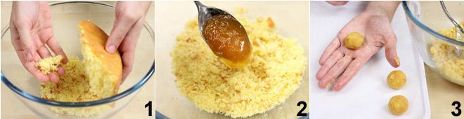 Um die Cake Pops zuzubereiten, beginnen Sie damit, 400 g Biskuit zu besorgen. Alternativ können Sie unseren 7-Gläser-Kuchen, den Schokoladenkuchen verwenden oder Kuchenreste oder abgepackte Kuchen (wie beispielsweise Plumcake) nutzen. Zerkrümeln Sie den Kuchen mit den Fingern und entfernen Sie gegebenenfalls die Kruste, wenn sie zu trocken ist, und geben Sie die Krümel in eine Schüssel 1. Fügen Sie dann etwa 4 Esslöffel Ihrer bevorzugten Marmelade hinzu (einen nach dem anderen) 2 und mischen Sie mit den Händen, bis Sie eine ziemlich feste Masse erhalten, um kleine "Bällchen" zu formen. Ich empfehle, die ersten zwei Esslöffel Marmelade hinzuzufügen, zu mischen und dann, nur wenn nötig, einen dritten oder eventuell einen vierten Löffel hinzuzufügen. Formen Sie aus der Masse Bällchen, die etwas kleiner als eine Walnuss sind, legen Sie sie auf ein Backpapier und lassen Sie sie für etwa eine halbe Stunde im Gefrierschrank fest werden 3.