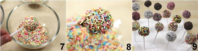 Wenn Sie möchten, können Sie sie dann mit geriebener Kokosnuss, Haselnusskrokant oder bunten Zuckerstreuseln bedecken (7-8) und sie trocknen lassen, indem Sie die Stiele in eine Styroporbasis stecken 9.