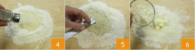 Um die Cantucci mit Gorgonzola herzustellen, beginnen Sie damit, die Pinienkerne zu rösten: Stellen Sie eine Pfanne auf den Herd und rösten Sie die Pinienkerne, wobei Sie häufig umrühren, um ein Anbrennen zu vermeiden 1. Lassen Sie die Pinienkerne abkühlen und geben Sie sie dann zusammen mit den Walnüssen in einen Mixer und hacken Sie sie grob für ein paar Sekunden, sie sollten nicht fein zerkleinert werden 2. Gehen Sie dann zur Teigzubereitung für die Cantucci über: Sieben Sie auf einer Arbeitsfläche das Mehl, Weinstein und Natron und bilden Sie einen klassischen Brunnen. Geben Sie den geriebenen Parmigiano Reggiano in die Mitte 3, salzen Sie,