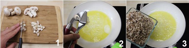 Um die Jakobsmuscheln mit Wein zuzubereiten, beginnen Sie damit, die Pilze gründlich zu waschen und zu trocknen. Schneiden Sie sie fein 1 und braten Sie sie in einer Pfanne an, in der Sie die Butter, einen Schuss extra natives Olivenöl und den zerdrückten Knoblauch geschmolzen haben (2-3).
