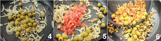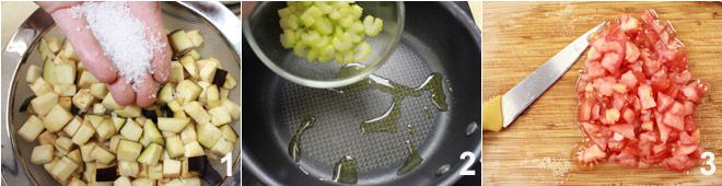 Waschen und schneiden Sie die Auberginen in kleine Würfel und legen Sie sie in ein Sieb, bestreut mit grobem Salz. Lassen Sie sie so etwa eine Stunde ruhen, damit sie das Wasser verlieren 1. In der Zwischenzeit schneiden Sie die Selleriestangen in dünne Streifen und blanchieren Sie sie in Salzwasser, dann abtropfen lassen, trocknen und in Öl bei schwacher Hitze anbraten 2. Schneiden Sie die Zwiebel und die Tomaten in Würfel 3.
