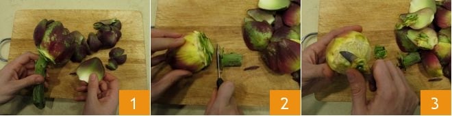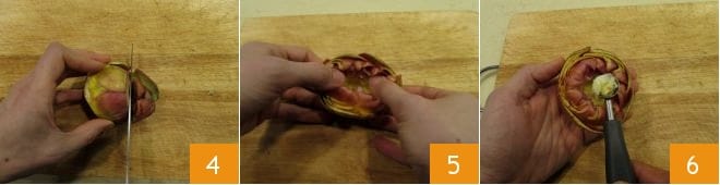Schneiden Sie die Spitzen der Artischocken ab 4, drücken Sie die Blätter leicht nach außen 5 und entfernen Sie den "Bart" mit einem Teelöffel oder einem Kugelausstecher 6 (alternativ können Sie auch einen Teelöffel verwenden).