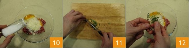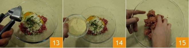 Drücken Sie die Knoblauchzehe 13 und fügen Sie schließlich auch das Paniermehl hinzu 14; mischen Sie alles kräftig mit den Händen, um die Zutaten gut zu vermengen 15.