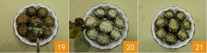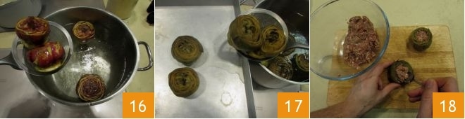 Stellen Sie einen Topf mit reichlich Salzwasser auf den Herd und kochen Sie die Artischocken 10 Minuten lang 16; lassen Sie sie dann abkühlen und legen Sie sie auf ein Tablett 17. Füllen Sie die Artischocken anschließend vorsichtig mit 3 Teelöffeln der vorbereiteten Fleischfüllung, achten Sie darauf, sie nicht zu zerbrechen 18.