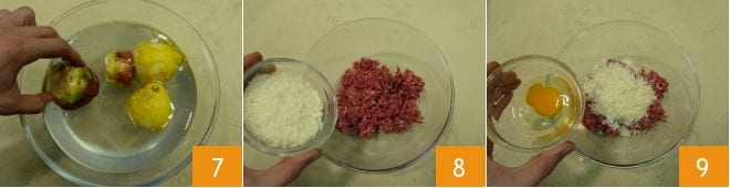 Legen Sie die gereinigten Artischocken in eine Schüssel mit kaltem Wasser und Zitronensaft, um zu verhindern, dass sie sich verfärben 7. Fahren Sie mit der Zubereitung der Fleischfüllung fort: Geben Sie das Hackfleisch in eine große Schüssel mit dem geriebenen Käse 8 und dem ganzen Ei 9;