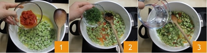 Um die Casarecce mit Bohnenpüree zu zubereiten, lassen Sie eine fein gehackte Zwiebel in einem Antihafttopf mit wenig Öl für ein paar Minuten auf niedriger Flamme anbraten. Wenn die Zwiebel goldbraun ist, fügen Sie die gefrorenen Bohnen, das Tomatenmark 1, den gehackten Fenchel 2 und das kalte Wasser 3 hinzu, das Sie vorher gesalzen haben.