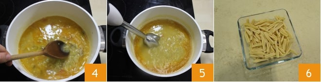 Lassen Sie alles auf kleiner Flamme etwa 2 Stunden lang kochen, gelegentlich umrühren, bis Sie eine ziemlich dichte Konsistenz erreichen 5. Mit einem Stabmixer alles zu einer Creme pürieren 6, einige Gemüsestücke sichtbar lassen, dann mit Salz abschmecken und bei Bedarf Chili hinzufügen. Nehmen Sie die Pasta 6
