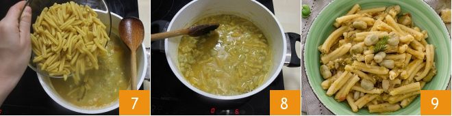 und geben Sie sie in das Bohnenpüree 7; immer auf kleiner Flamme kochen und gelegentlich umrühren 8. Nach dem Kochen mit einem Faden rohem Olivenöl würzen; servieren Sie die Casarecce mit Bohnenpüree zusammen mit warmen Brotcrostini 9.