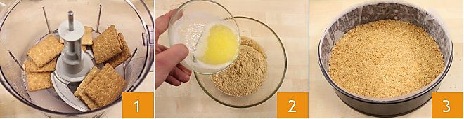 Um den Schokoladen-Birnen-Käsekuchen zuzubereiten, beginnen Sie mit dem Boden: Geben Sie die trockenen Kekse in den Mixer und zerkleinern Sie sie fein 1. Schmelzen Sie die Butter in einem kleinen Topf und geben Sie in der Zwischenzeit die zerkleinerten Kekse in eine Schüssel. Fügen Sie nach und nach die geschmolzene Butter zu den zerkleinerten Keksen hinzu und mischen Sie alles gut 2. Fetten Sie eine Springform mit einem Durchmesser von 22 cm ein und kleiden Sie dann Boden und Ränder mit Backpapier aus (lesen Sie in der Kochschule nach, wie Sie eine Form mit Backpapier auslegen, hier). Gießen Sie die zerbröselten Kekse in die mit Backpapier ausgelegte Form und drücken Sie mit einem Löffel den Keksboden gut fest 3. Kühlen Sie die Mischung eine halbe Stunde im Kühlschrank oder etwa zehn Minuten im Gefrierschrank.