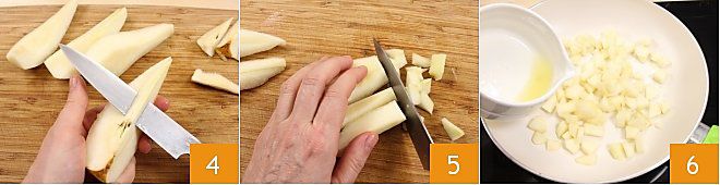 Jetzt widmen Sie sich der Creme: Schälen Sie die Birnen, entfernen Sie die Kerne 4 und schneiden Sie sie in Würfel 5. Geben Sie die Birnenwürfel in eine antihaftbeschichtete Pfanne und lassen Sie sie mit dem Zitronensaft kochen 6.