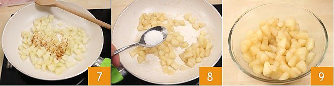 Fügen Sie eine Prise Zimt 7, einen Esslöffel Zucker 8 und 4 Esslöffel Wasser hinzu. Lassen Sie es einige Minuten kochen, bis die Birnen weich und ziemlich trocken sind. Sobald sie fertig sind, geben Sie sie in eine Schüssel und lassen Sie sie abkühlen 9.