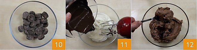 Jetzt bereiten Sie die Schokolade vor, die mit dem Frischkäse vermischt wird: Geben Sie die Zartbitterschokolade in eine Schüssel 10 und stellen Sie diese in einen Topf, der zur Hälfte mit Wasser gefüllt ist. Schalten Sie den Herd ein und schmelzen Sie die Schokolade im Wasserbad. Geben Sie in eine separate Schüssel den Frischkäse und den Puderzucker und vermischen Sie die beiden Zutaten mit dem elektrischen Mixer. Fügen Sie dann die geschmolzene und abgekühlte Schokolade hinzu und schlagen Sie die Zutaten auf 11. Wenn Sie eine homogene Mischung erhalten haben 12, geben Sie sie in eine Küchenmaschine (oder in eine große Schüssel, um sie mit einem elektrischen Mixer zu bearbeiten), fügen Sie die Eier hinzu und schalten Sie das Rührgerät ein.