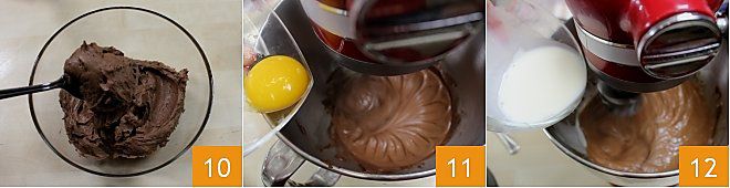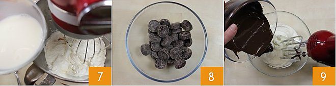 Lassen Sie die Mischung aus Sahne und Gelatine abkühlen, dann fügen Sie sie dem Rest der Creme hinzu 7, und stellen Sie sie beiseite. Bereiten Sie nun die Schokoladencreme vor: Geben Sie die dunkle Schokolade in eine Schüssel 8 und stellen Sie sie in einen Topf, der zur Hälfte mit Wasser gefüllt ist. Dann erhitzen Sie das Wasser, um die Schokolade im Wasserbad zu schmelzen. In einer separaten Schüssel geben Sie den Frischkäse und den Puderzucker und mischen Sie die beiden Zutaten mit dem elektrischen Mixer. Fügen Sie dann die abgekühlte geschmolzene Schokolade hinzu und schlagen Sie die Zutaten auf 9.
