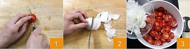 Um das Chutney aus Kirschtomaten zuzubereiten, beginnen Sie damit, die Kirschtomaten gründlich zu waschen und zu trocknen. Dann legen Sie sie auf ein Schneidebrett und halbieren Sie sie 1. Schälen Sie anschließend die weiße Zwiebel, halbieren Sie sie und schneiden Sie sie in dünne Scheiben 2. Nehmen Sie nun einen großen Topf und geben Sie die halbierten Kirschtomaten und die geschnittene Zwiebel hinein 3.